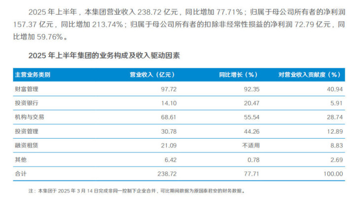 对于上半年主要业务分部收入明显增长,国泰海通在半年报中表示,一方面吸收合并海通证券后,公司业务规模扩大,另一方面,公司把握市场契机,全面推动零售、机构和企业三大客户服务体系建设,各项业务稳步发展。报告期内,因吸收合并海通证券产生负商誉79.64亿元,计入营业外收入,该非经常性损益对集团合并利润产生重大影响。